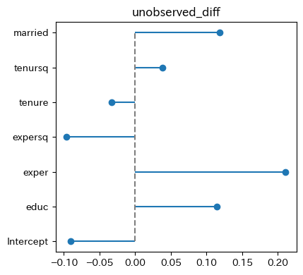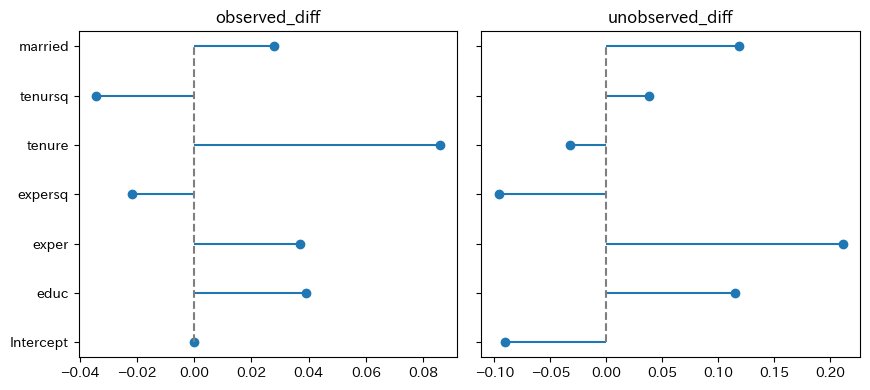 observed_diff - \(\bar{\boldsymbol{X}}^f(\boldsymbol{\beta}^m - \boldsymbol{\beta}^f)\):2つのグループの観測できない要因の違いに起因する被説明変数の差